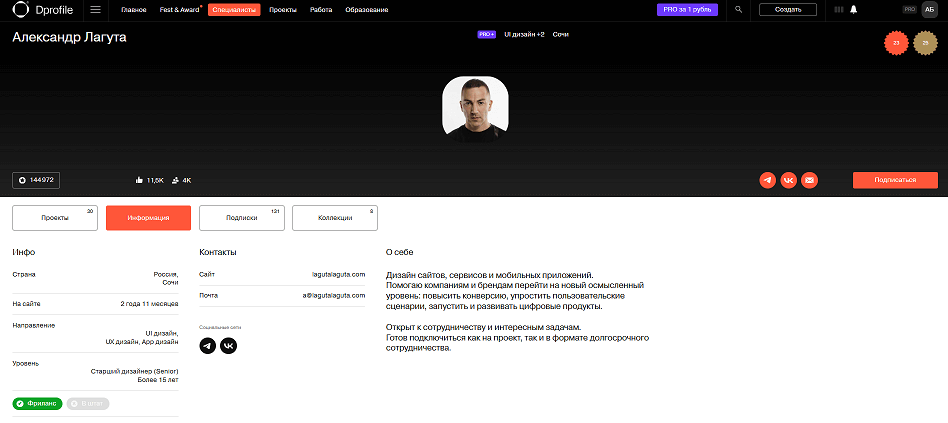 DProfile сочетает в себе витрину, портфолио и возможности фриланс-биржи. Это удобно: не нужно переводить потенциальных клиентов с одной платформы на другую — можно показать кейсы и сразу же обсудить условия сотрудничества в личке.