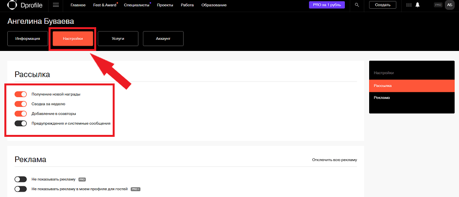 В разделе «Настройки» кликните по вкладке «Настройки» и активируйте нужные уведомления. Здесь же можно отключить всю рекламу, но только после оформления подписки.