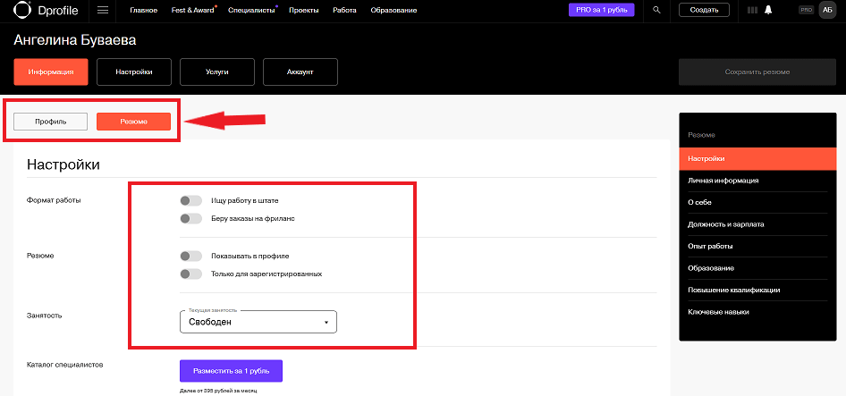 Если планируете искать работу в найме на DProfile, заполните соседний раздел — «Резюме». Укажите предпочтительный формат работы (фриланс или штат), текущую занятость и настройки видимости резюме. Здесь же можно добавить себя в каталог специалистов, но эта функция доступна только после подключения Pro-подписки.
