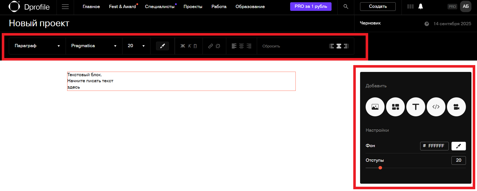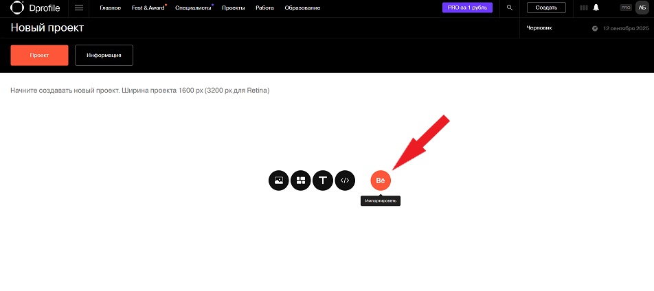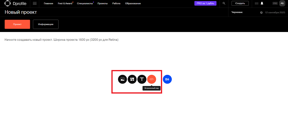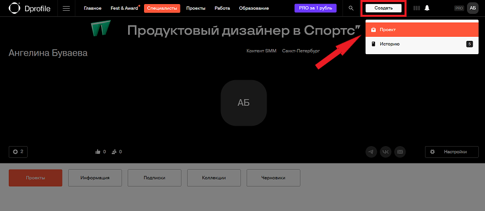 После заполнения профиля оформите портфолио. Для добавления работы перейдите в раздел «Профиль – Проекты» и нажмите на значок «+». Еще один способ — нажать на кнопку «Создать» в правом верхнем углу интерфейса и выбрать в контекстном меню «Проект».