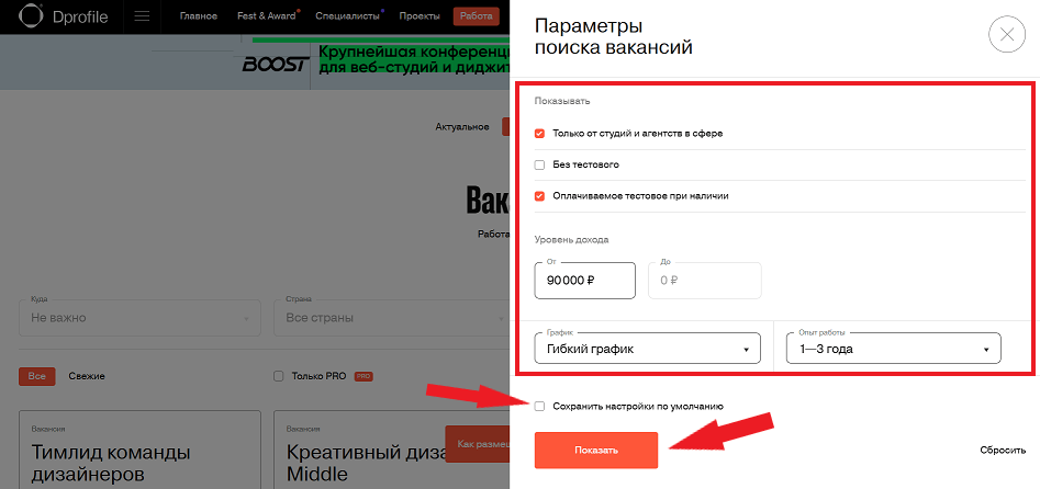 Чтобы видеть только интересные вакансии, перейдите в раздел «Работа – Вакансии», откройте блок «Параметры», укажите свои пожелания, отметьте чекбокс «Сохранить настройки по умолчанию» и нажмите «Показать».