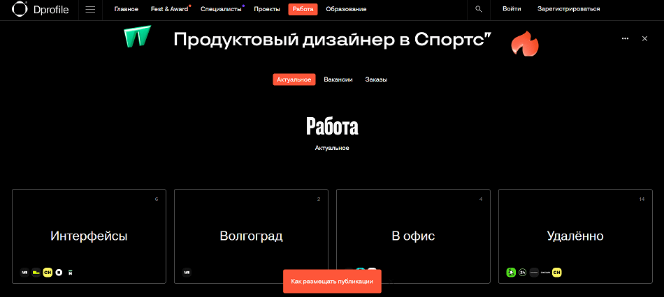 Раздел «Работа» объединяет заказчиков и исполнителей. Здесь публикуются вакансии и разовые задачи, на которые можно откликнуться, прикрепив к ответу релевантные кейсы из портфолио.