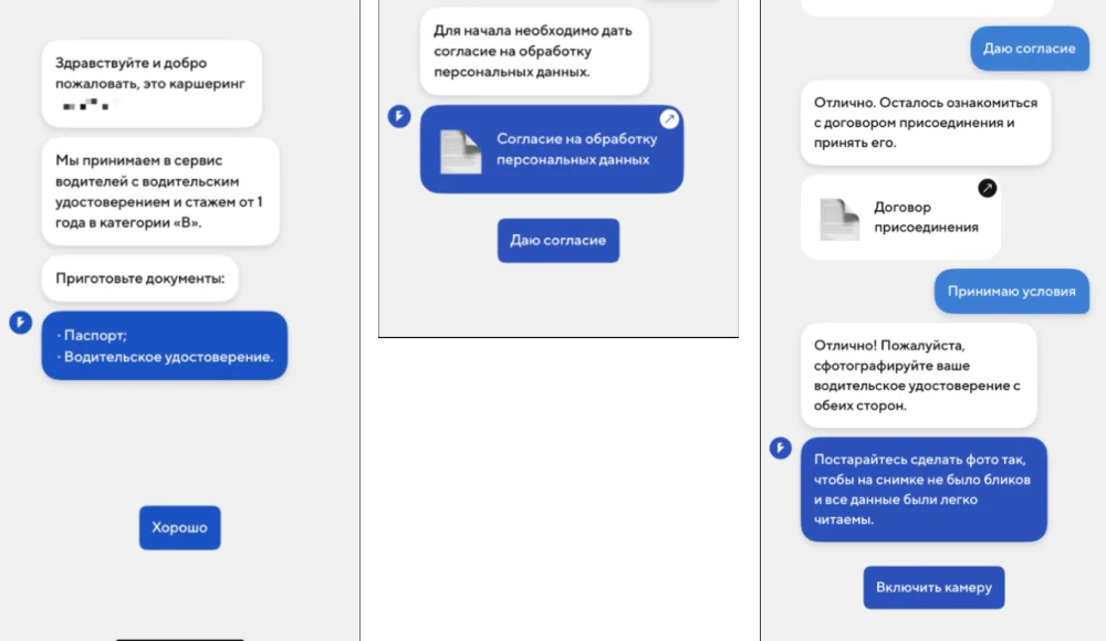 В качестве примера — процесс проверки личности в сервисе московского каршеринга. Скачиваем приложение и начинаем общаться с чат-ботом — он выдает пошаговые инструкции и подсказки по созданию фотографий.