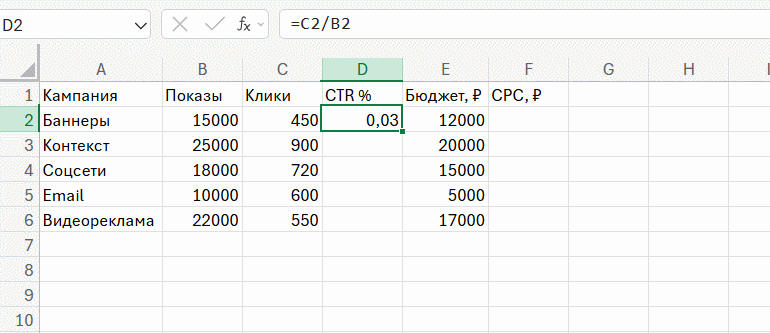 Рассмотрим этот способ на примере таблицы с маркетинговыми кампаниями. В ней мы считаем показатель CTR — делим количество кликов на количество показов. Для этого в ячейке D2 вводим формулу =C2/B2, а затем протягиваем её маркером вниз. В результате CTR рассчитывается сразу для всех строк.