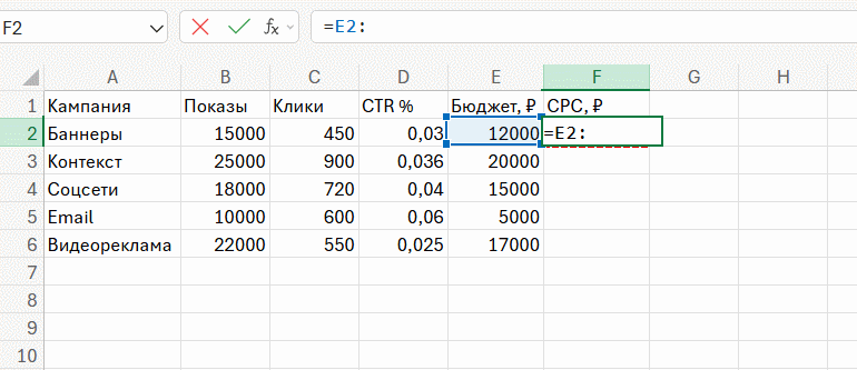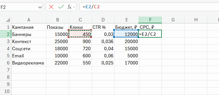 А теперь в той же таблице рассчитаем CPC: у нас есть столбец Бюджет (E) и столбец Клики (C). Нужно поделить бюджет на клики. Вводим формулу в F2, а затем с помощью горячих клавиш протягиваем формулу.