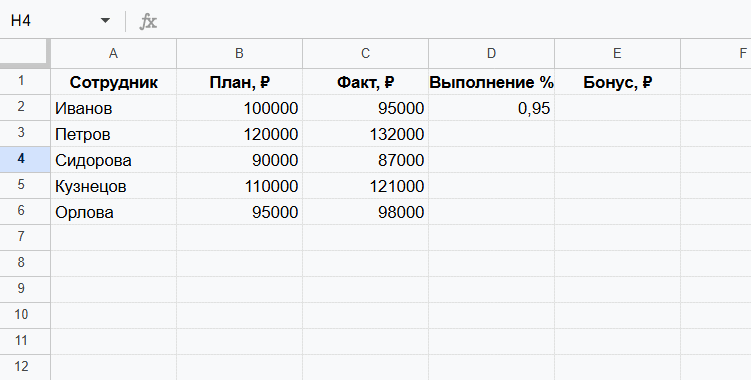 Рассмотрим этот способ на примере таблицы с KPI сотрудников. В ней мы считаем процент выполнения плана продаж — делим факт продаж на план. Для этого в ячейке D2 вводим формулу =C2/B2, а затем протягиваем её маркером вниз.