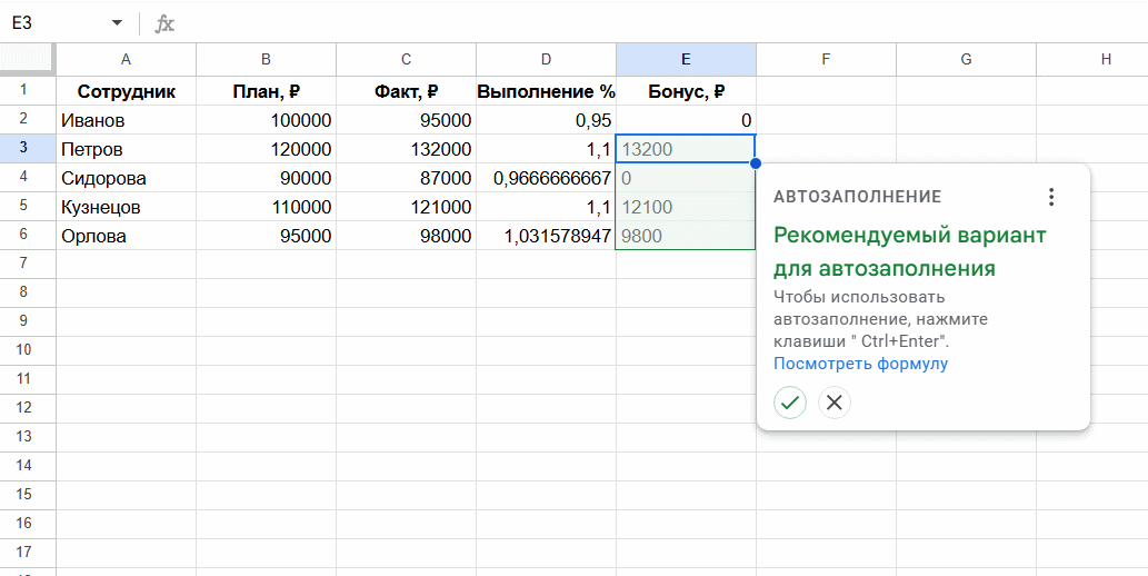 Google Таблица может сама предложить распространить формулу на весь столбец. Это удобно, когда нужно быстро применить один и тот же расчет ко всем строкам.