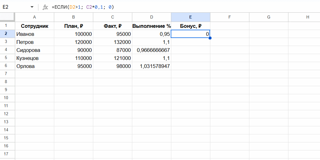 А теперь в той же таблице рассчитаем KPI сотрудников, применяя чуть более сложную формулу, с условиями.