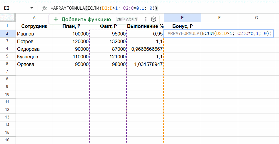 Если нужно, чтобы формула работала для всего столбца без ограничения по строкам, используйте конструкцию с «E2:E/С2:С», то есть без указания финального числа. При добавлении новых данных формула будет учитывать их автоматически.