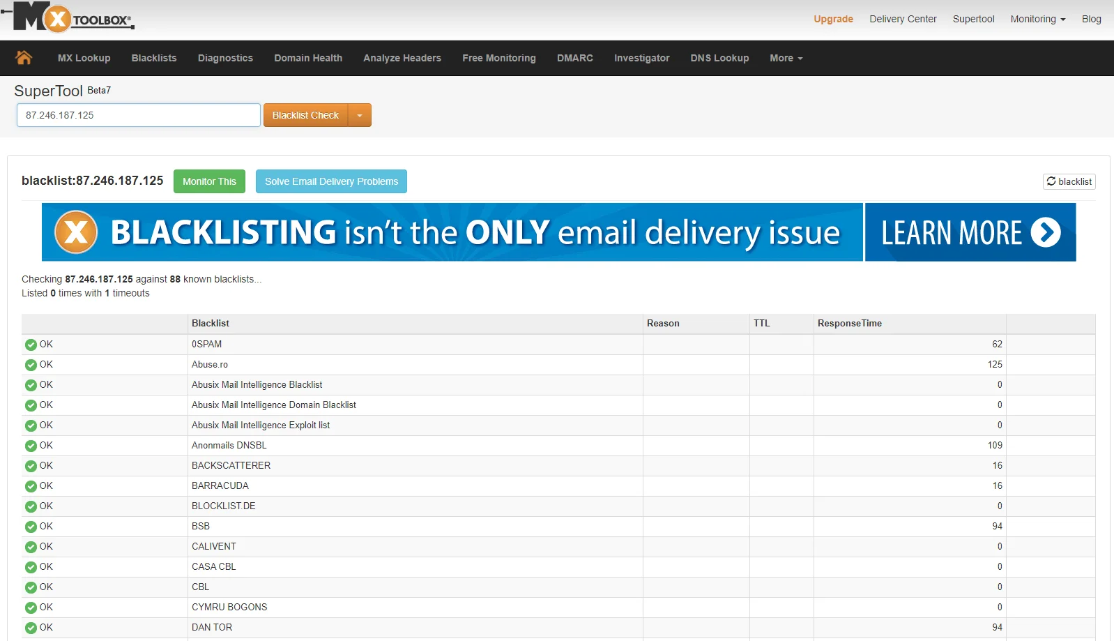 На изображении ниже видно, что MxToolBox проверил адрес 87.246.187.125 по 88 блэклистам. Этого IP нет ни в одном из них.