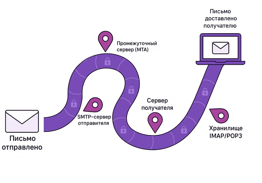 Когда вы отправляете письмо, оно не летит напрямую от вашего компьютера к получателю. Сначала письмо проходит через почтовый сервер отправителя, потом через несколько промежуточных серверов — и только потом попадает в нужный ящик. На каждом этапе данные могут быть перехвачены.