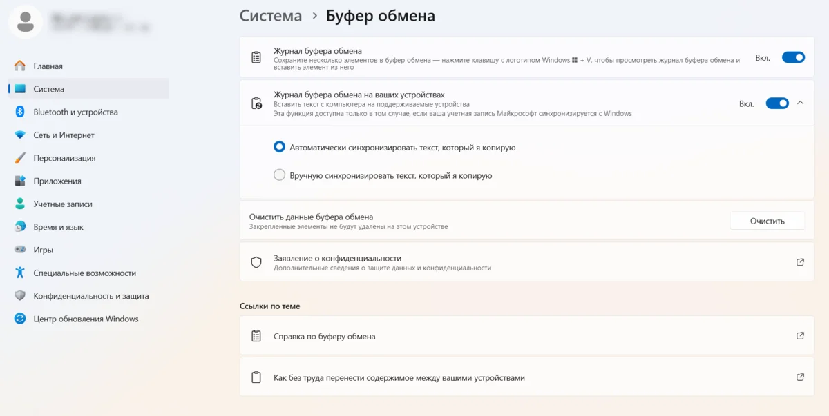 Дополнительно Windows 10 и 11 позволяют синхронизировать данные буфера с другими устройствами на той же ОС. Например, можно обмениваться скопированными элементами между настольным компьютером и ноутбуком на Windows. Включить опцию можно через путь: «Система» → «Буфер обмена» → «Журнал буфера обмена на ваших устройствах».