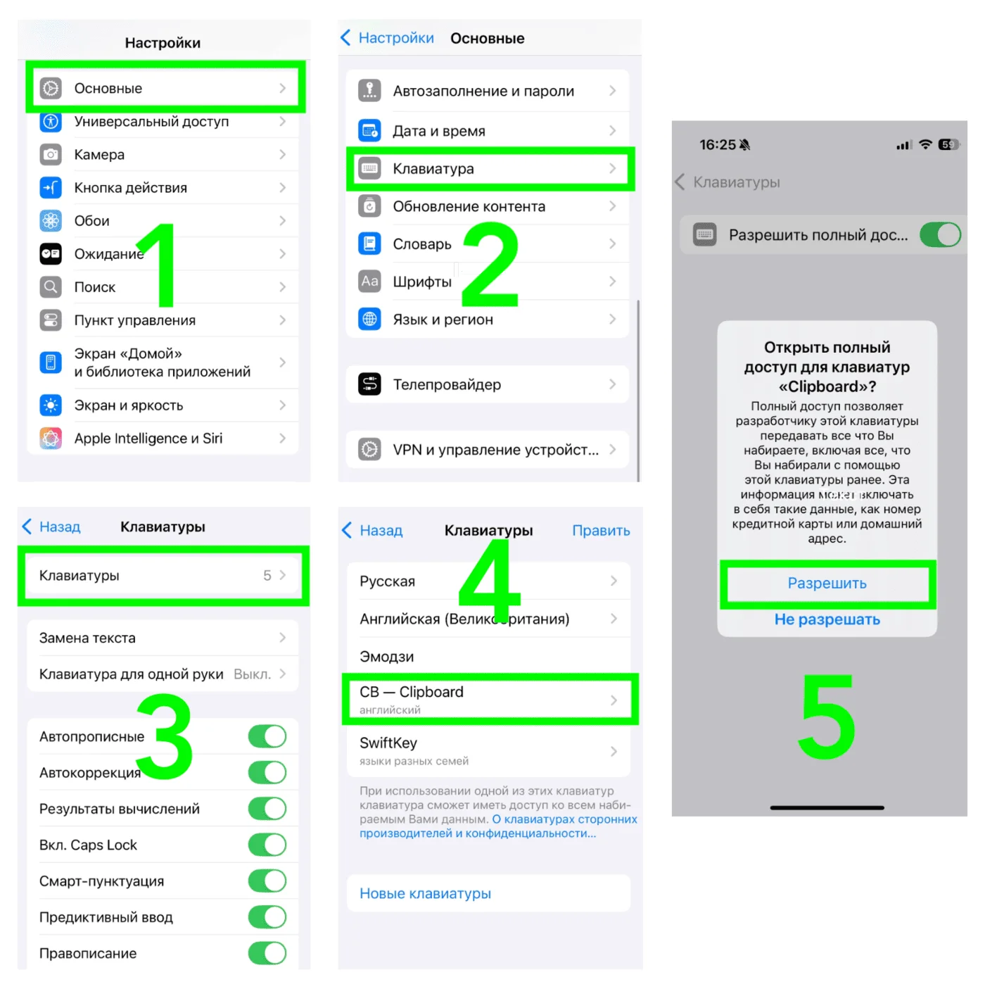 После установки программу нужно активировать: «Настройки» → «Основные» → «Клавиатуры» → «Новые клавиатуры» → «Clipboard» → «Разрешить полный доступ».