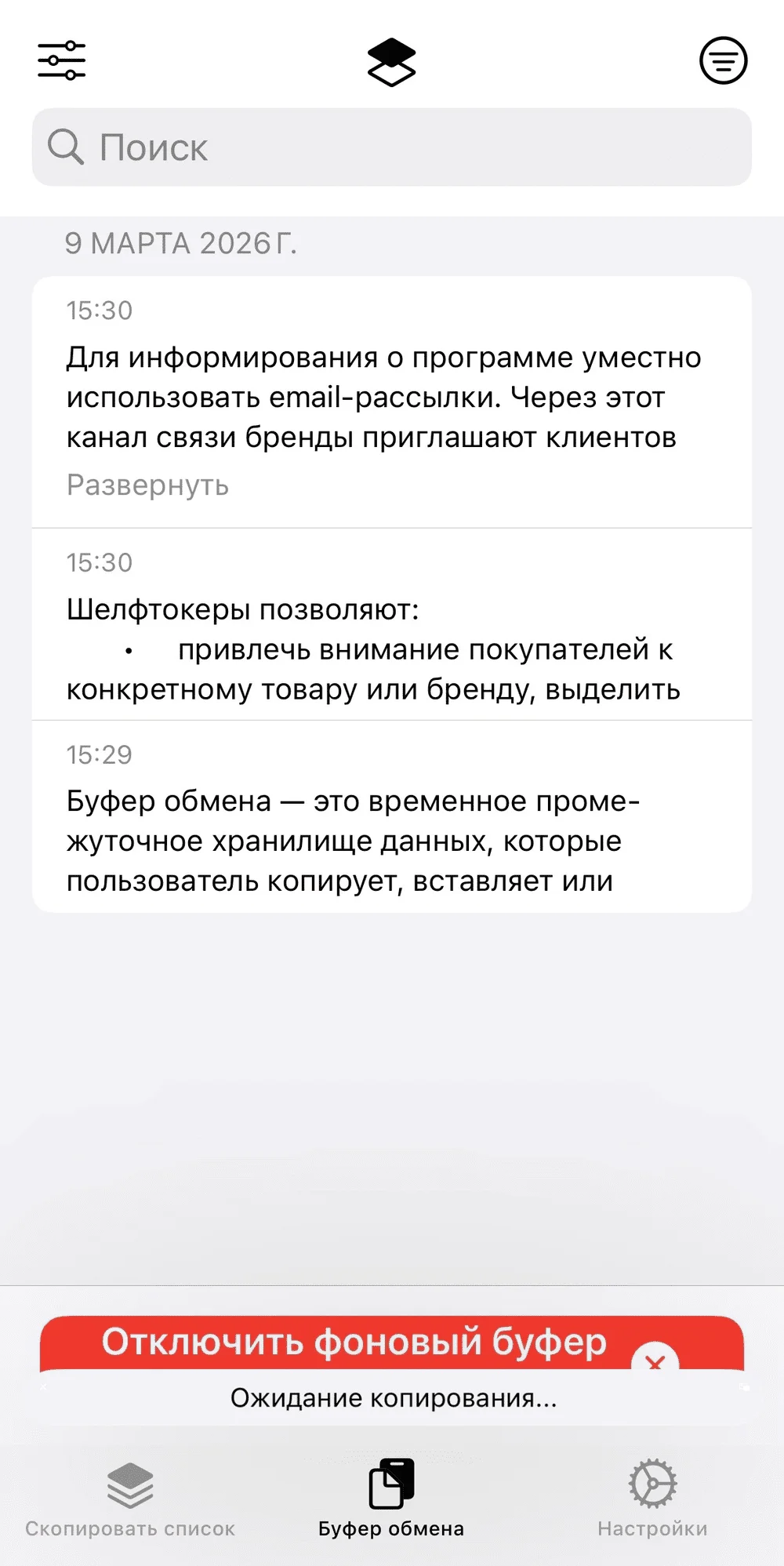 После активации в приложении будут доступны данные из буфера.