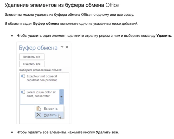 В программах Microsoft Office необходимо пройти путь: «Главная» → «Буфер обмена» → «Очистить все». Если нужно стереть конкретный объект, требуется кликнуть на него правой кнопкой мыши и выбрать опцию «Удалить».