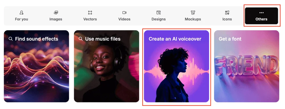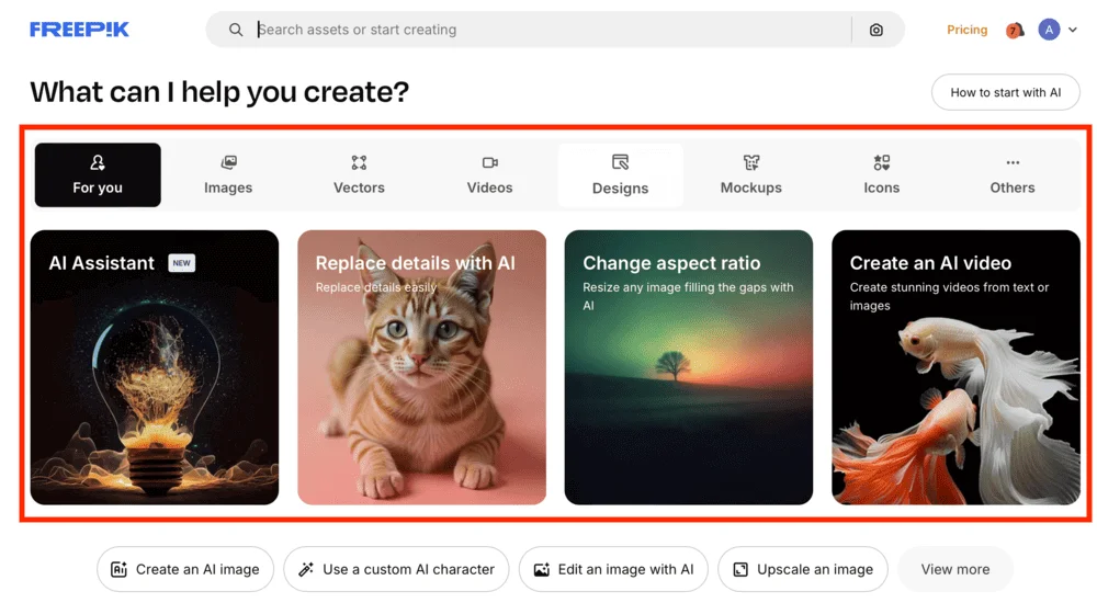Зарегистрируйтесь в Freepik на сайте по электронной почте или с помощью Google-аккаунта. Все основные инструменты сервиса находятся на первом экране страницы Home. Они распределены по категориям: для вас (то, чем чаще пользуетесь), изображения, векторы, видео, дизайн (шаблоны для визуального контента), мокапы, иконки и другое — здесь находятся инструменты для генерации звуков и голосов. Щелкните по любому, чтобы начать его использовать.