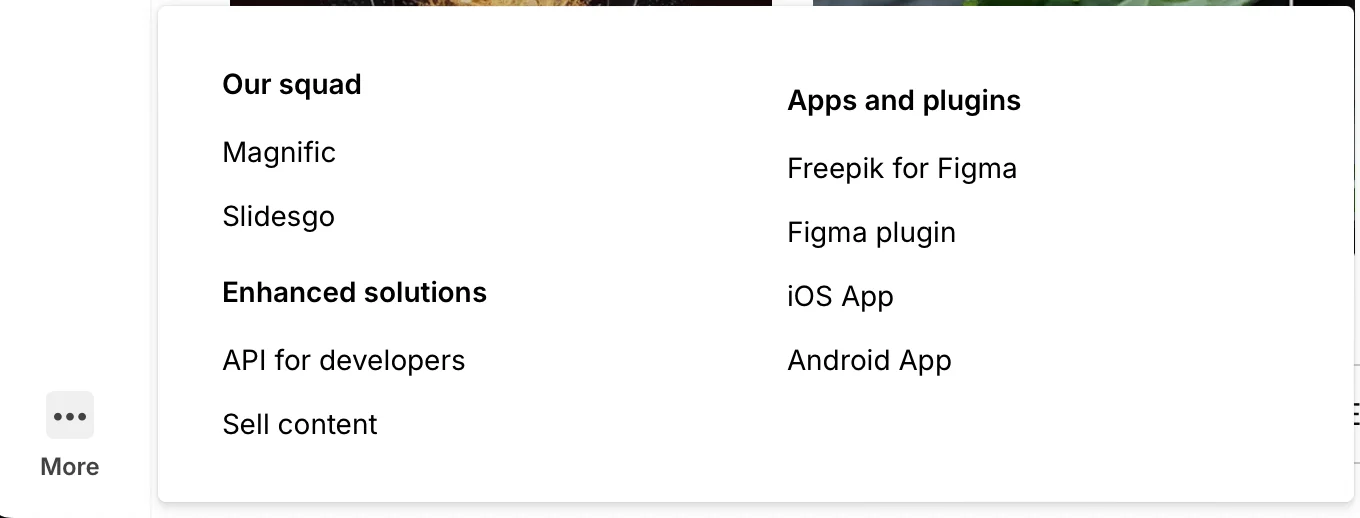 Внизу бокового меню по кнопке More открываются дополнительные возможности Freepik. Например, можно скачать плагин для Figma или установить приложение сервиса. Для разработчиков есть открытый API, а для дизайнеров и художников — возможность продавать свои творения через платформу. Только для этого обязательно нужен свой сайт.