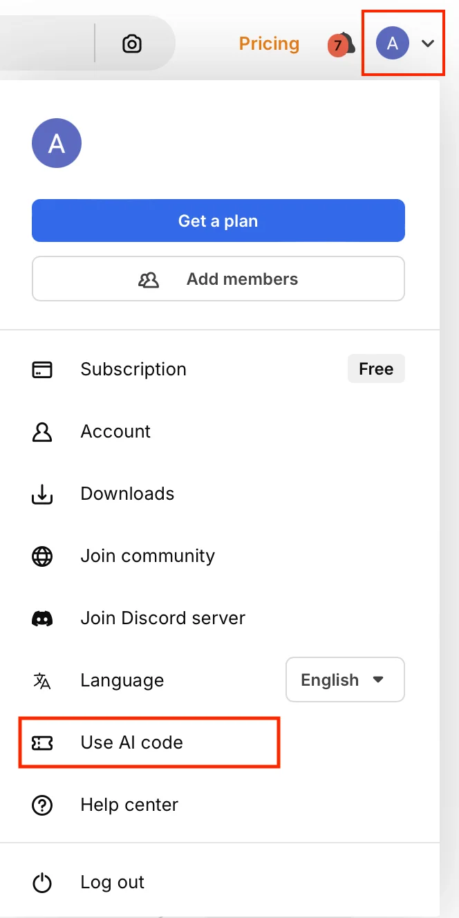 Владельцам подписки Pro и партнерам Freepik периодически рассылаются AI-коды — по сути, это те же промокоды. Они дают ранний доступ к новым инструментам, находящимся в бета-версии. Если у вас есть такой код, откройте меню, выберите Use AI code и введите его.