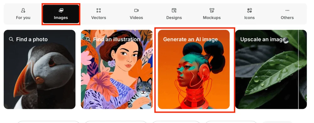 Также можно воспользоваться поиском — введите нужный запрос, чтобы найти инструмент или изображение. Либо загрузите картинку, и сервис предложит похожие варианты из стока.