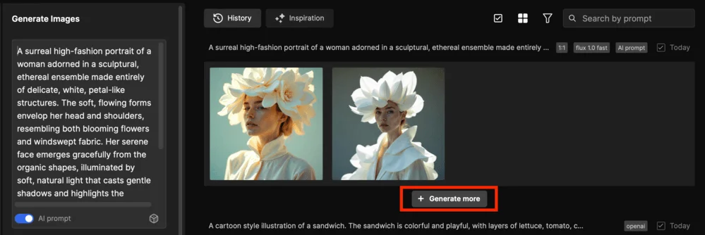 Введите промпт на английском — нейросеть сгенерирует два варианта изображения. Вместо текста можно загрузить изображение как референс для ИИ. Если полученные картинки не понравятся, нажмите под ними кнопку Generate more и получите еще два изображения. Только учтите, что каждая попытка забирает по 2 кредита, а всего их выдают 20 в день.
