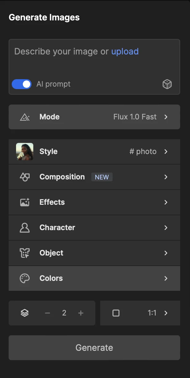 Инструмент для генерации стикеров и иконок находится в разделе Icons. Выберите Generate a sticker with AI или Generate an icon with AI — разницы нет.