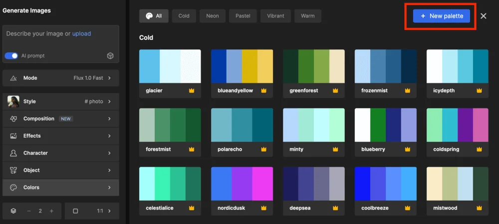 У каждой настройки есть фильтры для поиска и возможность создать собственный стиль, эффект, палитру и так далее. Для этого нажмите на кнопку New palette.