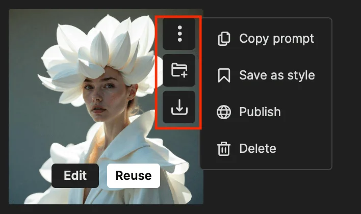 Чтобы сохранить сгенерированное изображение, нажмите на характерный значок со стрелочкой. Для добавления в проекты — на иконку с папкой. Вы можете сохранить промпт или стиль изображения для других генераций, опубликовать картинку на сайте сервиса или удалить ее, нажав на три точки.