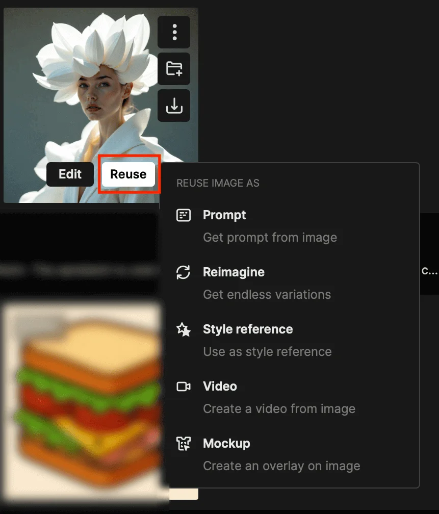 Если хотите продолжить работу с изображением, нажмите Reuse и выберите нужный вариант: сохранить промпт (Prompt), перегенерировать изображение (Reimagine), использовать как стиль для новых картинок (Style reference), превратить в короткое видео (Video) или встроить в готовый мокап (Mockup).