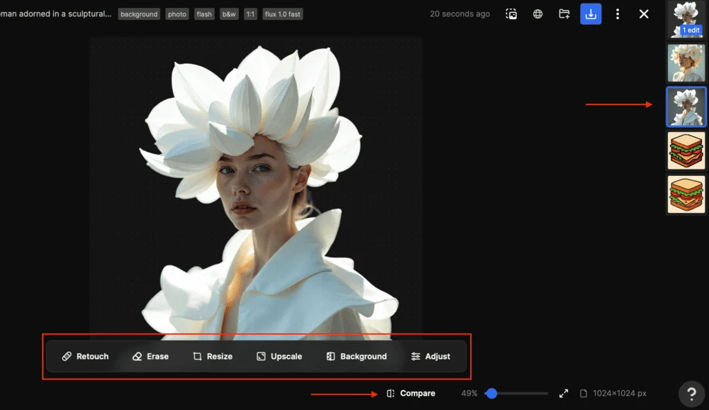 Чтобы внести изменения в изображение, нажмите Edit. В нижней части экрана откроются настройки, доступные для редактирования. Справа можно выбрать другую сгенерированную версию. Для сравнения текущего результата с оригиналом щелкните Compare.