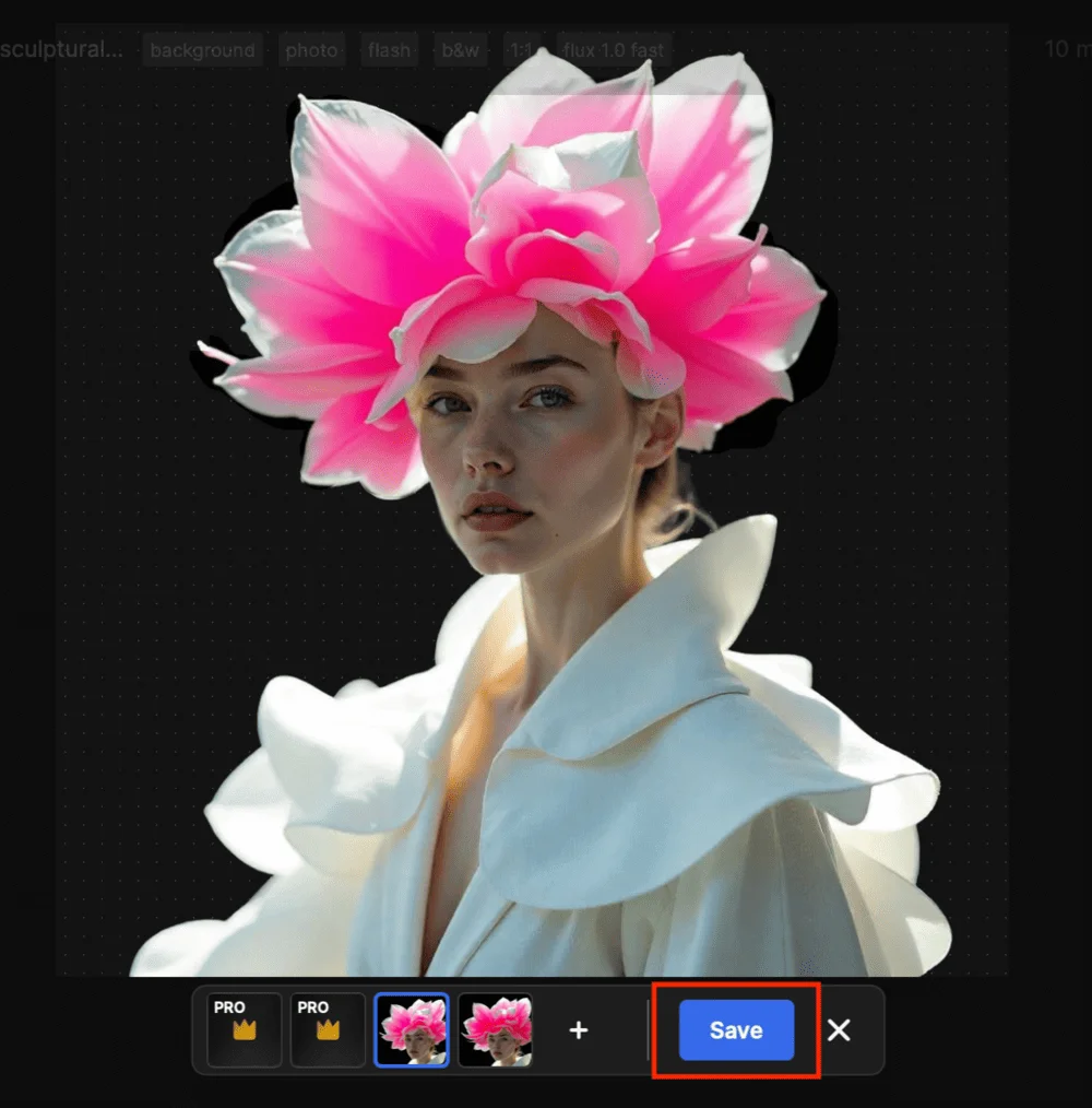 В результате появятся четыре варианта, но бесплатно доступны только два. Выберите понравившийся и нажмите Save. Если ни один не подошел, нажмите на плюс — нейросеть предложит новые изображения. Чтобы выйти без сохранения, закройте редактор с помощью крестика и вернитесь к исходному изображению.