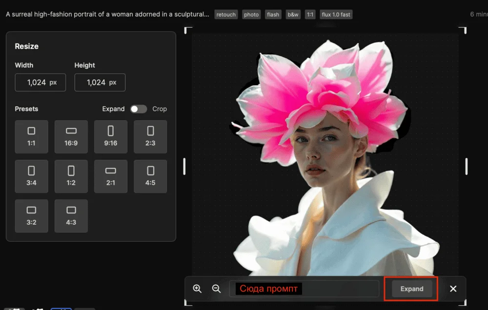 По кнопке Resize можно не только изменить масштаб изображения, но и расширить его. Для этого опишите в промпте, что должно быть на картинке, и нейросеть его продолжит. Затем нажмите Expand.