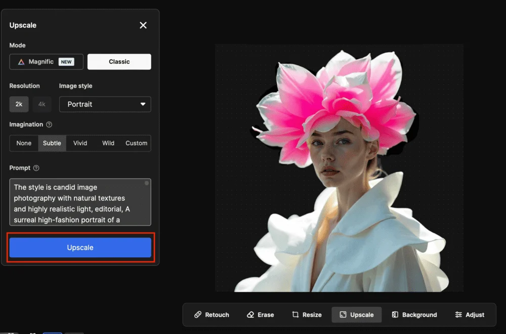 Опция Upscale повышает качество изображения. Здесь есть несколько настроек: