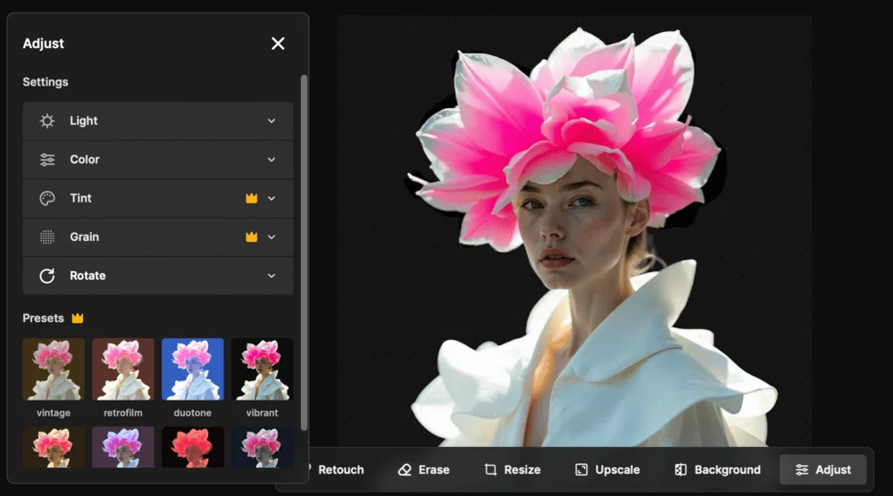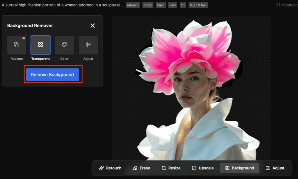 Опция Background позволяет удалить фон и сделать его прозрачным (Transparent), цветным (Color) и отредактировать его (Adjust). С подпиской можно еще его сгенерировать. Когда определитесь с выбором — нажмите Remove Background.