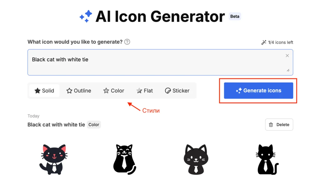 Интерфейс здесь сильно отличается от предыдущих инструментов и напоминает чат-бот с окошком для ввода промптов. На английском языке напишите запрос, выберите стиль для стикера или иконки и нажмите Generate Icons.