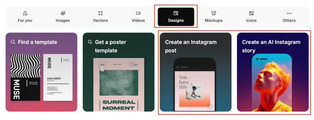 Чтобы оформить пост для соцсетей, карточку товара или слайды к презентации, в разделе Designs выберите Create an Instagram* post или story.