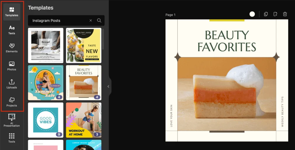 Редактор похож на Canva и подобные сервисы. Справа находятся готовые элементы, из которых можно собрать макет: шаблоны (Templates), текст (Text), иконки и фигурки (Elements), фотографии (Photos), загруженные материалы (Uploads).