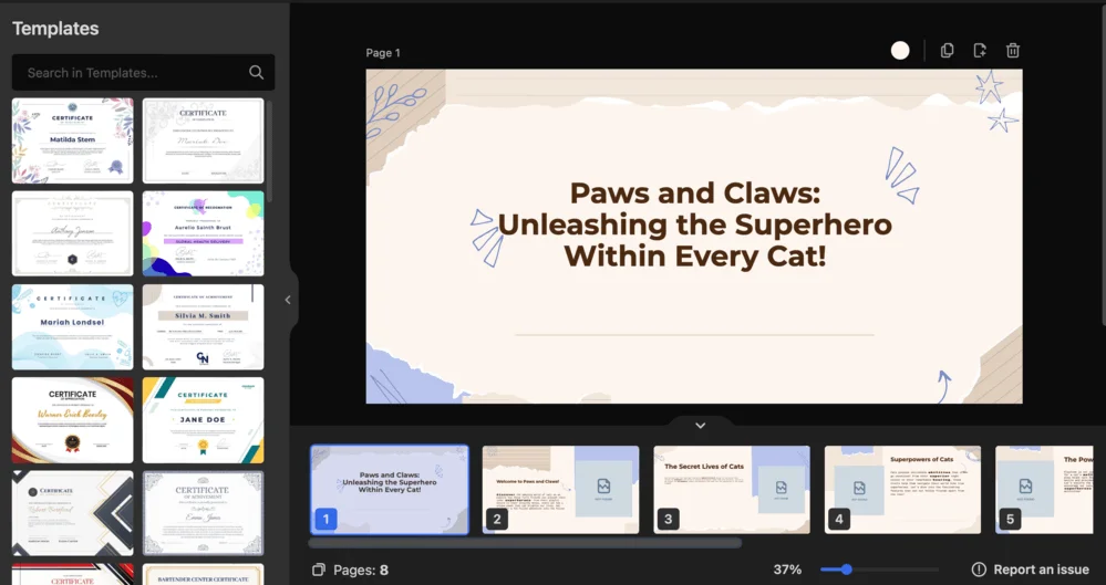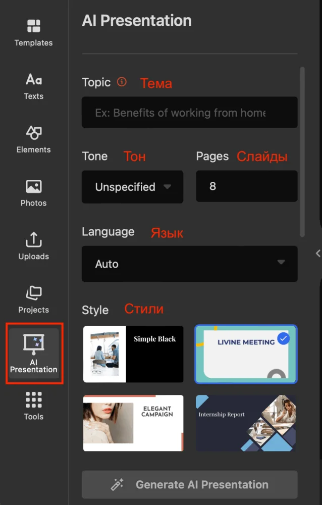 В AI Presentation получится сделать несколько одинаковых слайдов для презентации. Напишите тему доклада, выберите тон повествования, язык (русский есть, но нейросеть плохо с ним справляется), количество слайдов и стиль. Нажмите Generate AI Presentation и затем еще раз подтвердите запуск генерации.