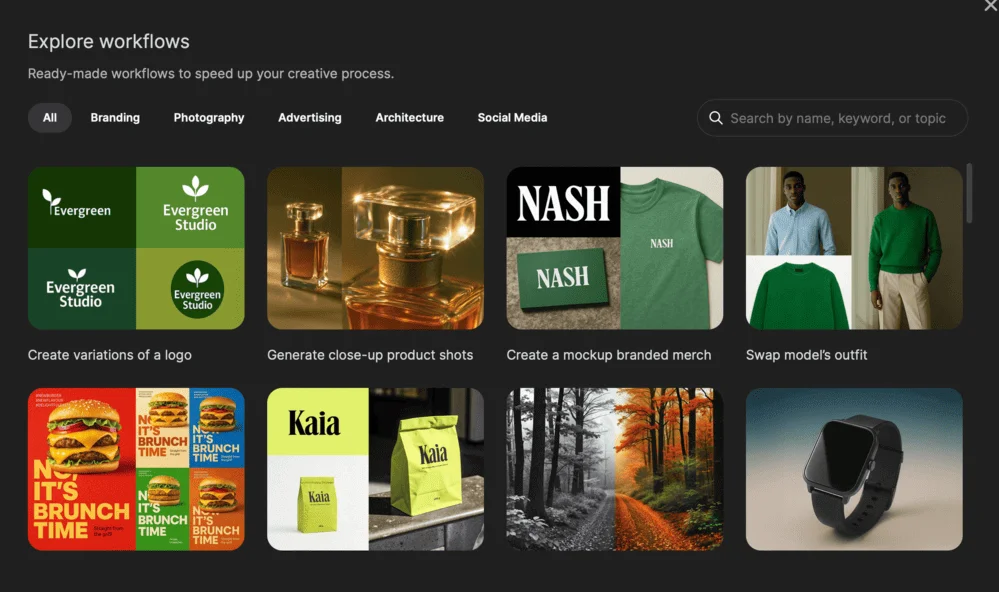 Кнопка с надписью Auto отвечает за размер изображения. Значок со звездочкой помогает выбрать стиль, а с палитрой — цветовую гамму. Workflows — это готовые промпты под разные задачи. Например, если нужен логотип, вместо продумывания запроса можно найти подходящий шаблон с промптом.
