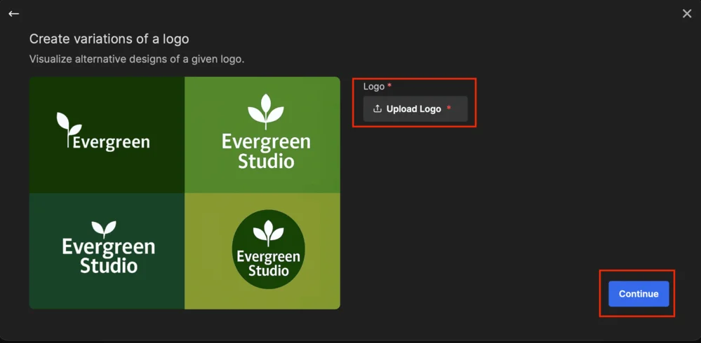 После загрузки изображения нажмите Continue — запрос сформируется автоматически и отобразится в чате. Далее нейросеть сгенерирует логотип или другой визуал в зависимости от выбранного промпта.