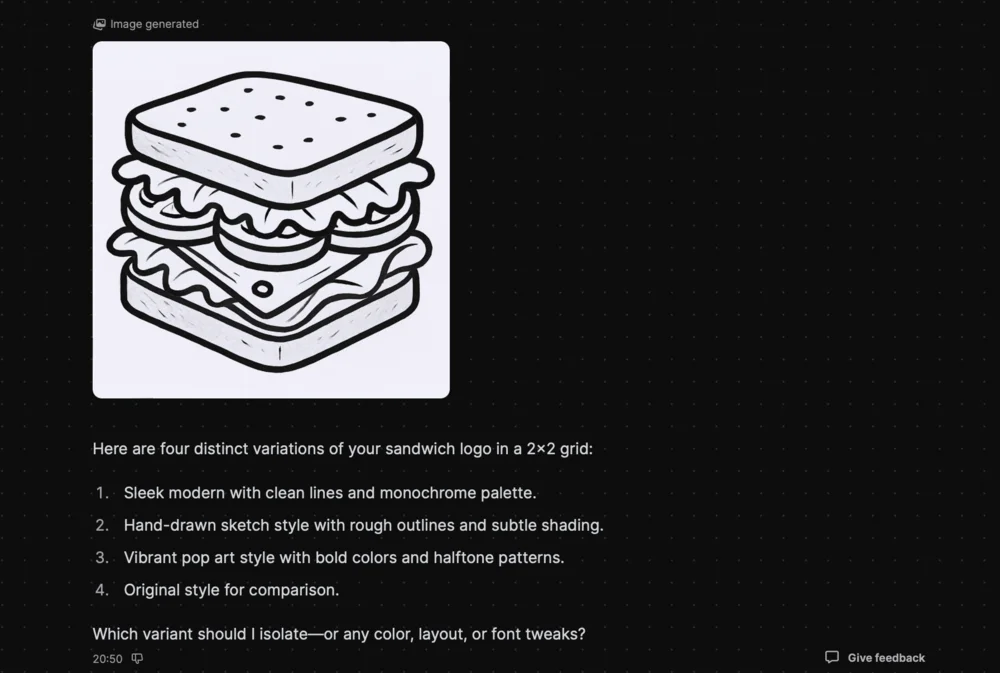 Загрузите референс. Я решила сделать логотип с сэндвичем, поэтому сначала сгенерировала бутерброд в нужном стиле и загрузила его в ассистента по кнопке Upload Logo.