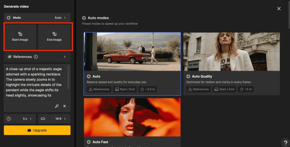 После выбора модели нужно загрузить изображения. Некоторые модели, вроде Auto, требуют два кадра: начальный и финальный. Другим достаточно одного. Чтобы загрузить файлы, нажмите на Start Image и End Image.