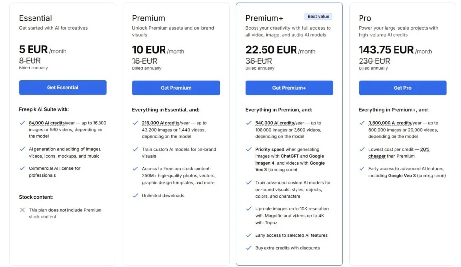 У Freepik есть бесплатный тариф, но он подойдет скорее для знакомства с платформой, чем для полноценной работы. Генерация видео, создание персонажей и собственных стилей в нем недоступны. Кроме того, каждый день пользователь получает только 20 кредитов на создание картинок, а расходуются они довольно быстро: одно изображение стоит 2 кредита, а простая правка вроде удаления фона — уже 3–5. Еще одно важное ограничение бесплатной подписки — отсутствие права на коммерческое использование созданного контента.