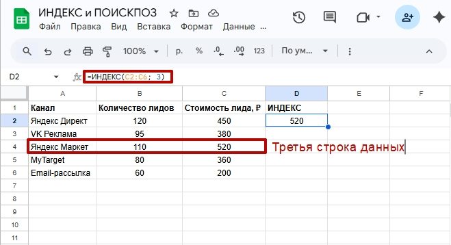 Например, у маркетолога есть таблица эффективности рекламных каналов. В столбце A указаны названия каналов, в столбце B — количество лидов, в столбце C — стоимость лида. Если пользователь знает, что нужный канал находится в третьей строке диапазона C2:C6, формула будет такой: