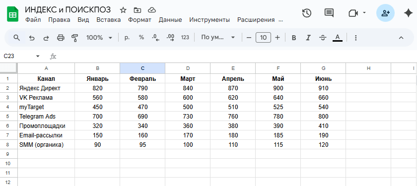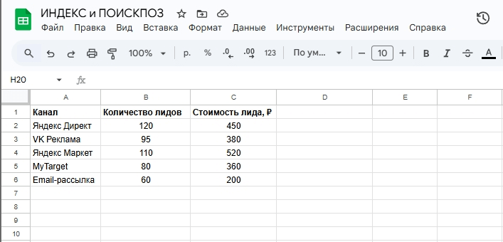 | 0 | Ищет точное совпадение значения в диапазоне. | ПОИСКПОЗ("VK Реклама"; A2:A10; 0) | Найди строку, где находится канал «VK Реклама». |