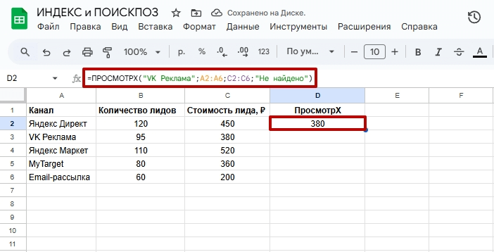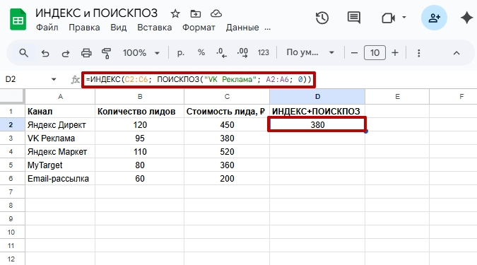 Функция ПОИСКПОЗ ищет строку, где написано «VK Реклама». В конкретном примере это вторая по счету строка. ИНДЕКС берет второе значение из столбца со стоимостью лидов. В итоге формула возвращает значение 380 ₽, стоимость лида по VK Рекламе.