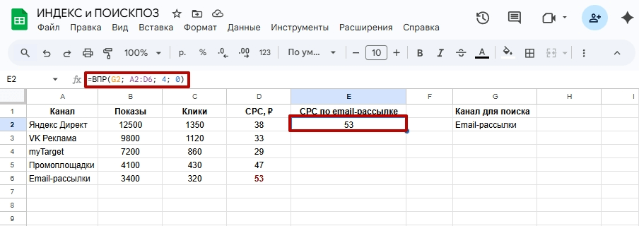 В ячейке G2 записано точное название канала «Email-рассылки». ВПР находит канал в столбце A и возвращает CPC из четвертого столбца диапазона.