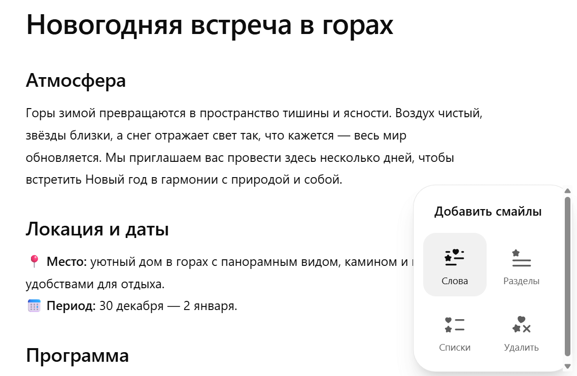 Добавить эмодзи. Эта функция вставляет уместные смайлики в текст. По кнопке нужно выбрать один из вариантов: