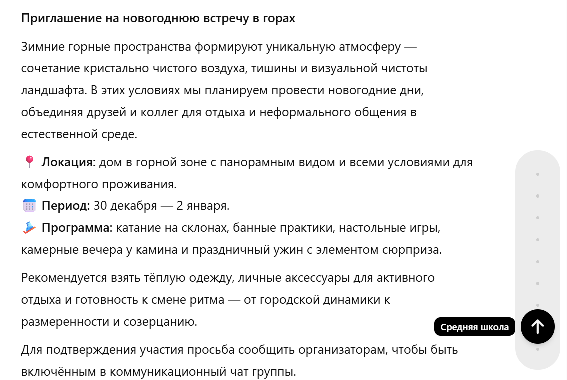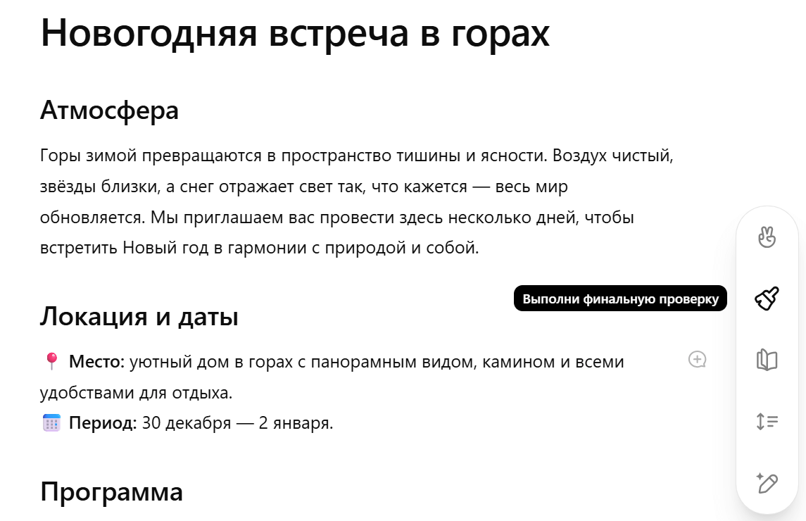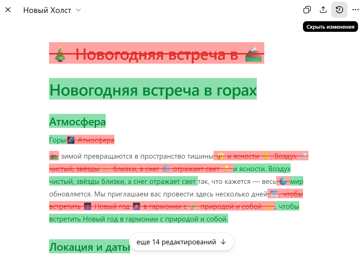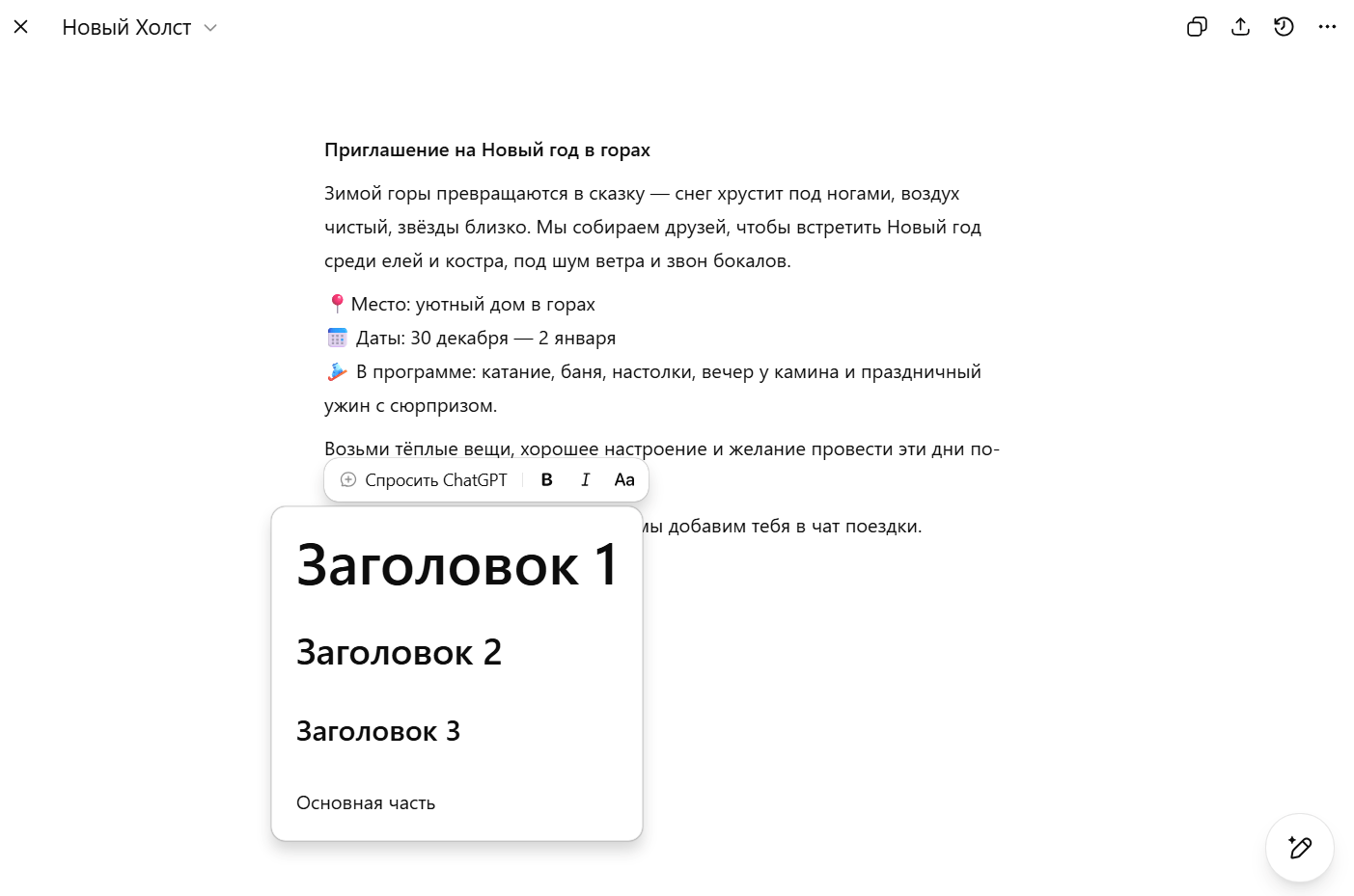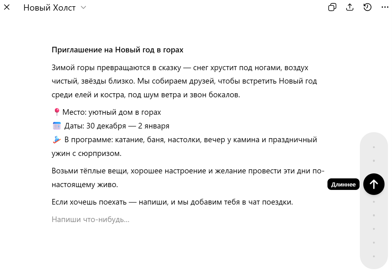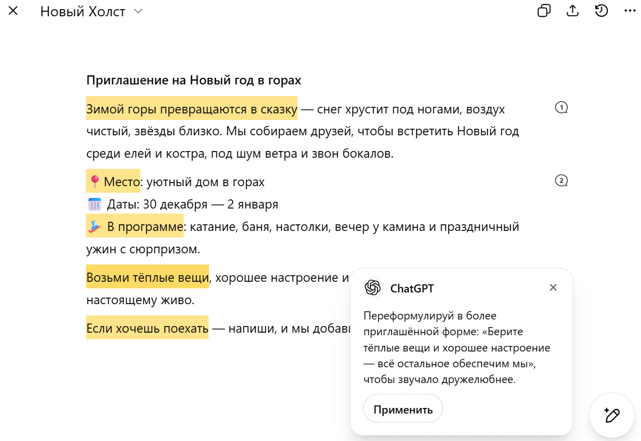 Например, вы можете попросить нейросеть сгенерировать черновик поста в блог, после чего холст автоматически откроется с полученным результатом. Выделить нужные фрагменты и дать указания вроде «сделать тон более дружелюбным» или «упростить формулировки». Чат-бот сразу применит правки к тексту, а вы увидите обновленный вариант.