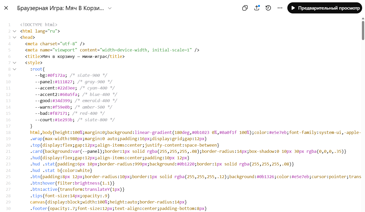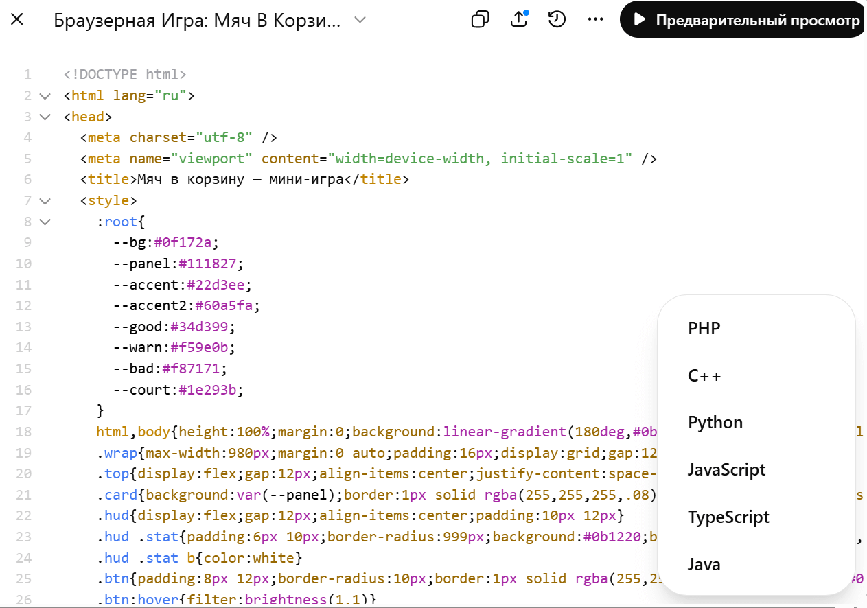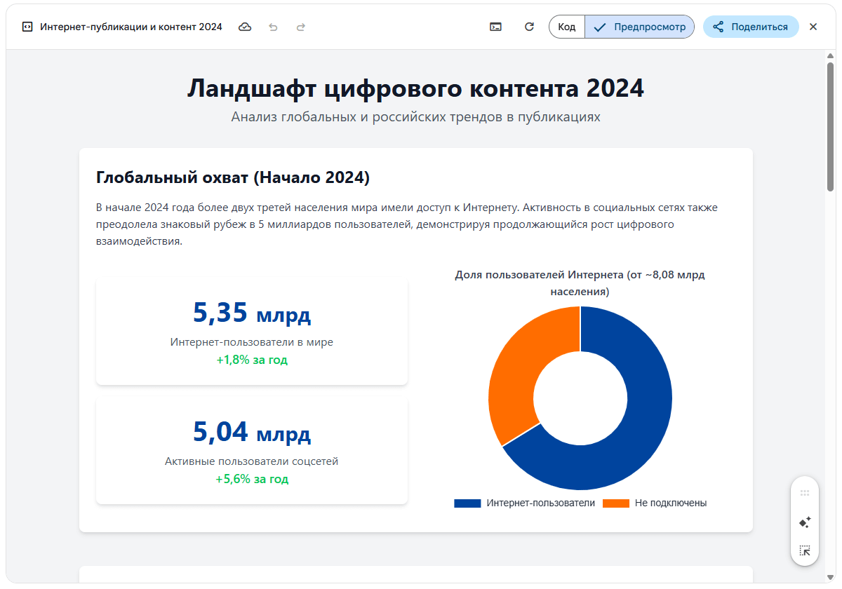 Canvas — удобный режим работы с нейросетью, когда нужно вносить точечные правки и многократно дорабатывать результат. Такой формат упрощает написание кода: можно включить предпросмотр, понять, что работает не так и попросить нейросеть переделать часть кода.