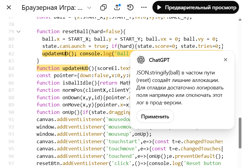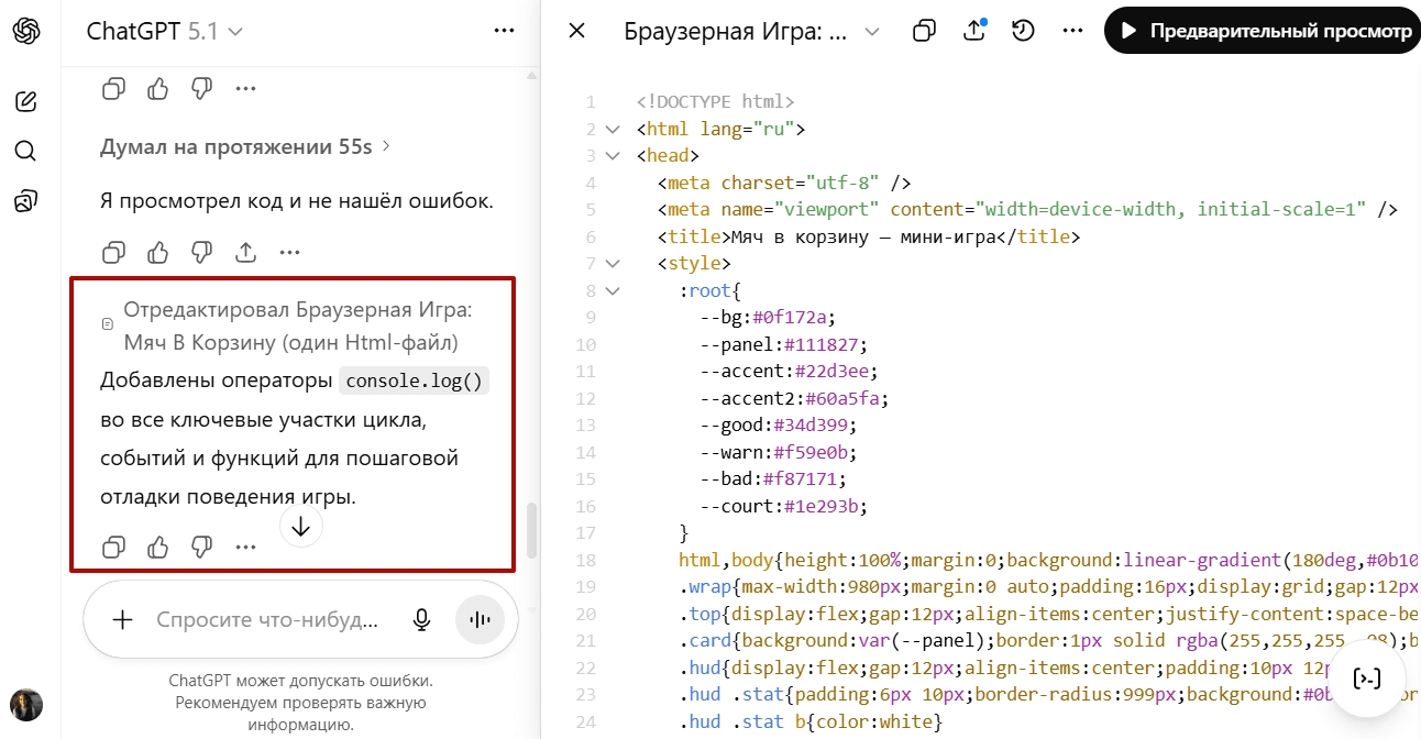 Написание кода. В Canvas можно составить скрипт, запустить его прямо в редакторе и посмотреть результат. Если код не работает, попросить нейросеть в диалоге найти ошибку или выделить в холсте нужный фрагмент и сказать ей исправить только его — так чат-бот не будет менять остальную часть кода.